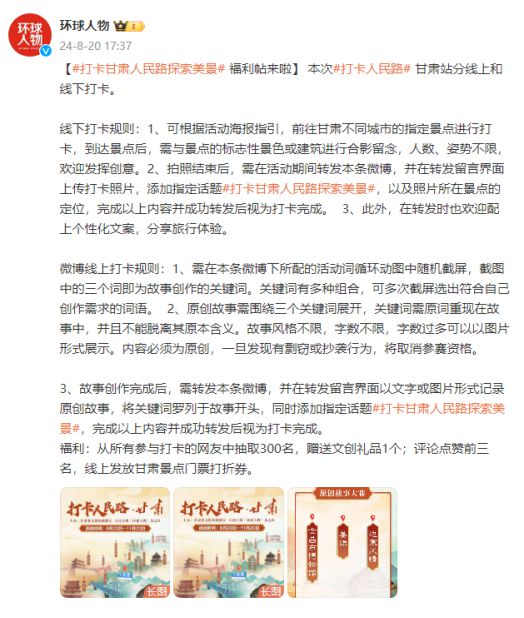游客可通過拍照、定位甘肅熱門旅游景點或撰寫甘肅原創(chuàng)故事的方式參與活動,轉(zhuǎn)發(fā)指定微博,將有機會活動甘肅文創(chuàng)產(chǎn)品一份。