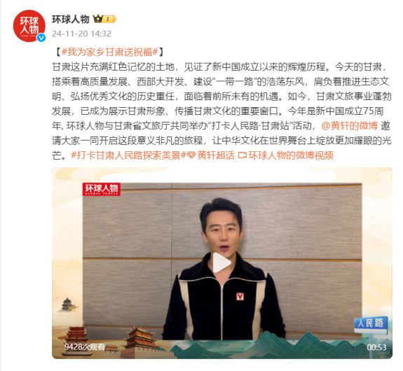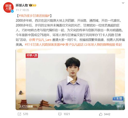 11月,活動邀請藝人黃軒、黃子弘凡、陳少熙通過視頻、轉(zhuǎn)發(fā)微博等形式分享甘肅文化特色和旅游魅力,進一步宣傳了甘肅的自然風(fēng)光和人文風(fēng)情,為活動助力。