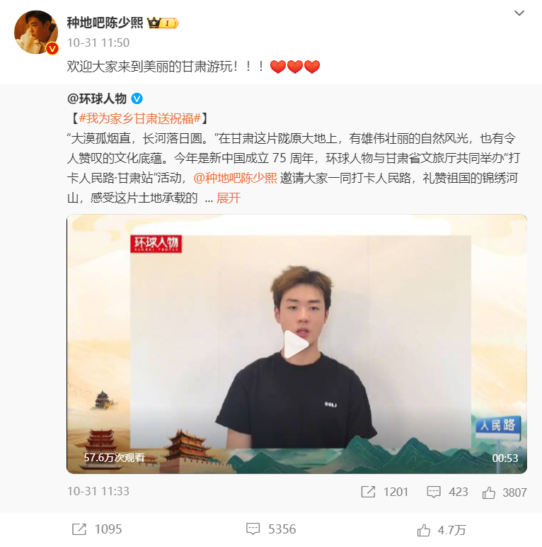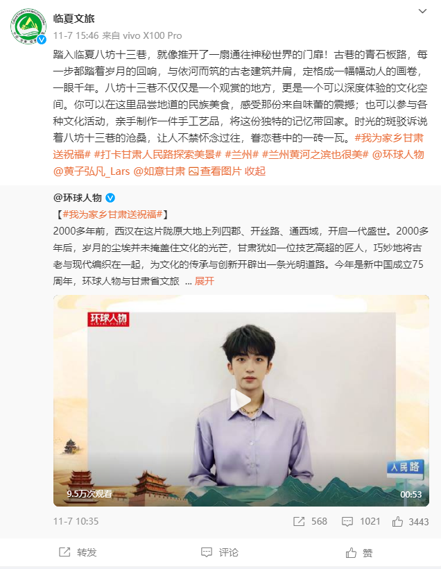 11月,活動邀請藝人黃軒、黃子弘凡、陳少熙通過視頻、轉(zhuǎn)發(fā)微博等形式分享甘肅文化特色和旅游魅力,進一步宣傳了甘肅的自然風(fēng)光和人文風(fēng)情,為活動助力。