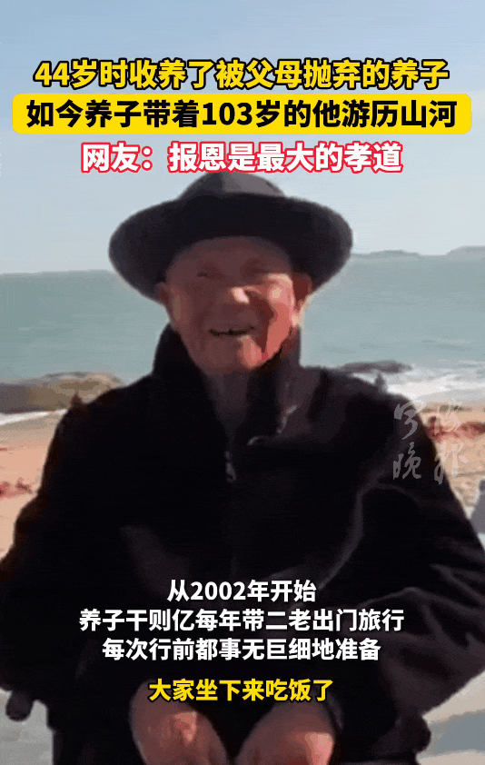 如今干則億帶著103歲的養(yǎng)父游歷山河