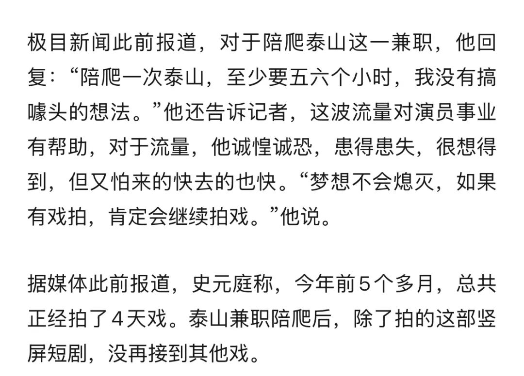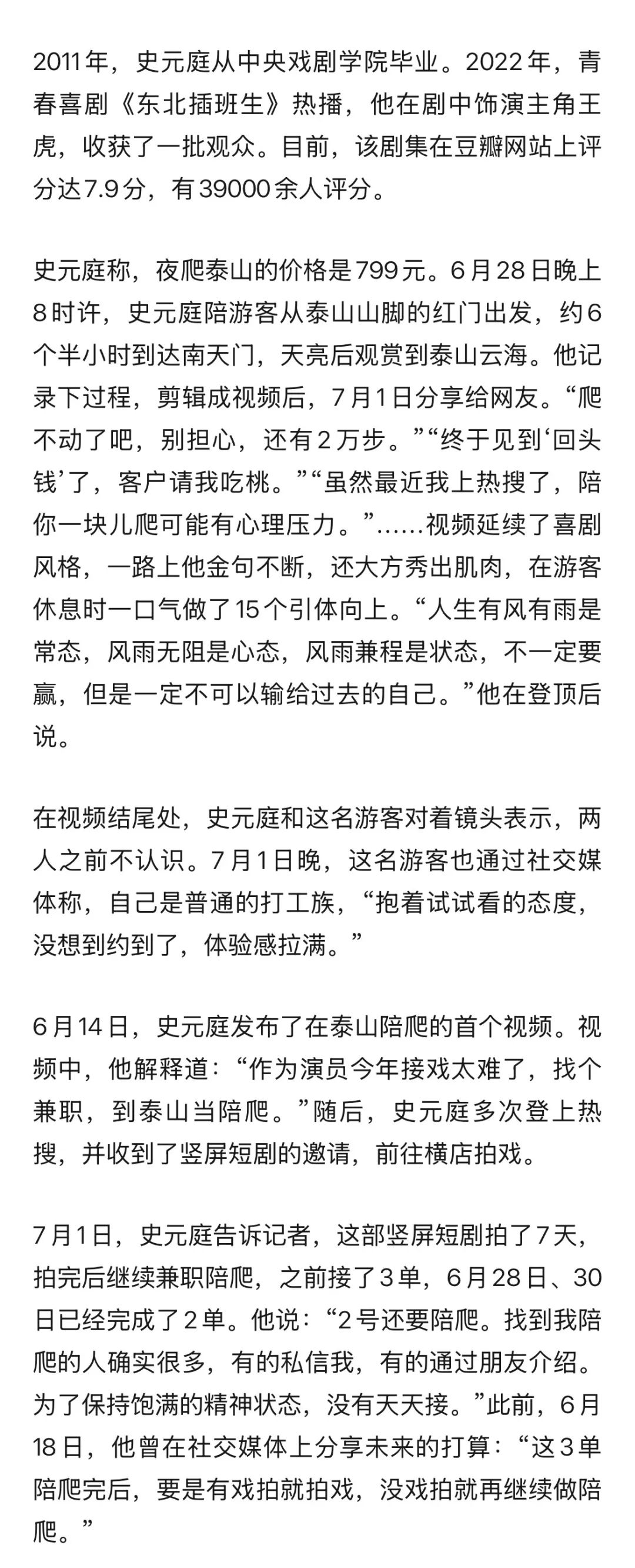 7月1日,因無戲可拍而兼職泰山陪爬的男演員史元庭,再次通過社交媒體發(fā)布視頻,分享陪游客在風(fēng)雨中夜爬泰山的經(jīng)歷。1日晚,史元庭向極目新聞?dòng)浾呓榻B:“這幾天都在泰山陪爬,7月2日還有一單。”