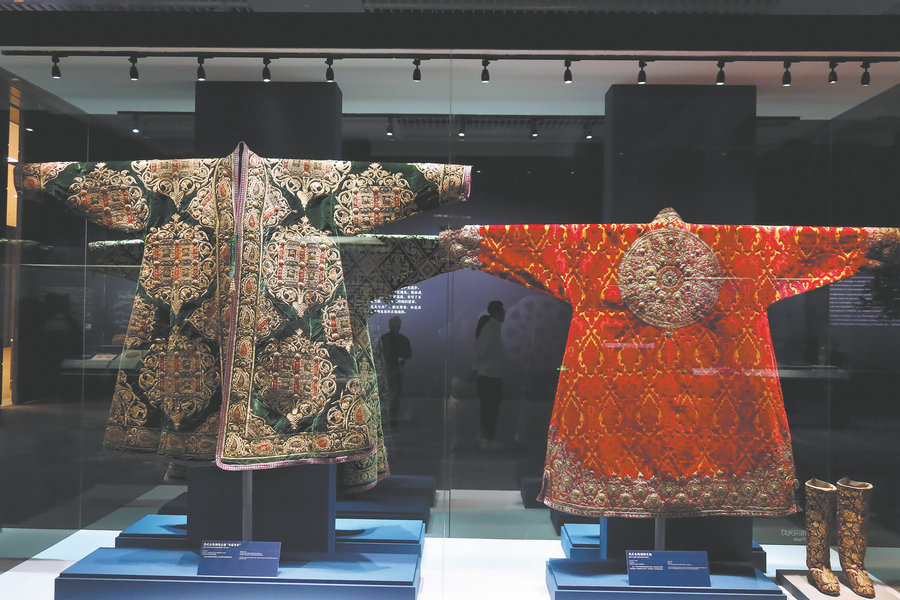 Also on show are textiles from the National Museum of the Republic of Kazakhstan. JIANG DONG/CHINA DAILY