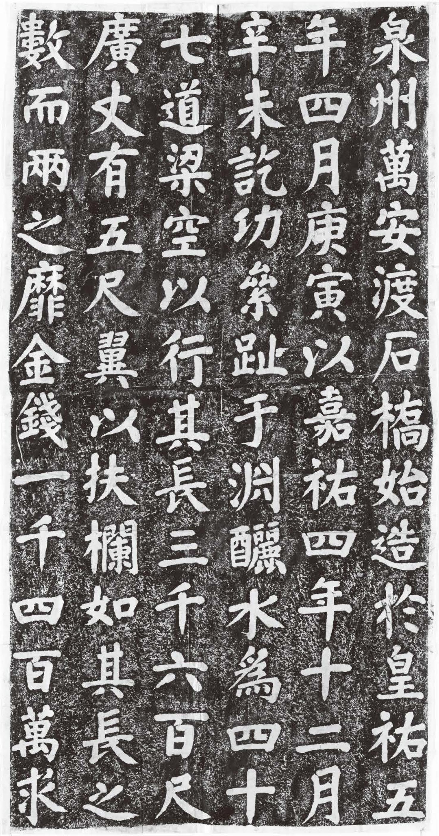 如今的萬安橋,附屬文物很多,其中最引人注目的是橋南的“忠惠蔡公祠”內(nèi),蔡襄自撰親書的《萬安橋記》碑。這是一篇大字楷書,字字莊正厚重,乍一看,讓人以為是顏真卿書,風(fēng)格太相近了。字為心跡,可見蔡襄不僅喜歡顏真卿的書法風(fēng)格,而且對(duì)顏真卿的人品也是從心底里“見賢思齊”。顏真卿謚號(hào)“文忠”,蔡襄謚號(hào)“忠惠”,他們兩人在為人、做事上頗多相似。