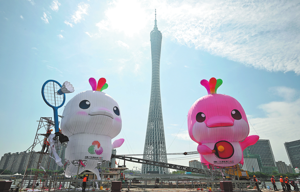 A pair of jumbo mascots are set up at the Haixinsha Wharf in Guangzhou, Guangdong province, on Nov 1, to embrace the 15th National Games. CHINA DAILY