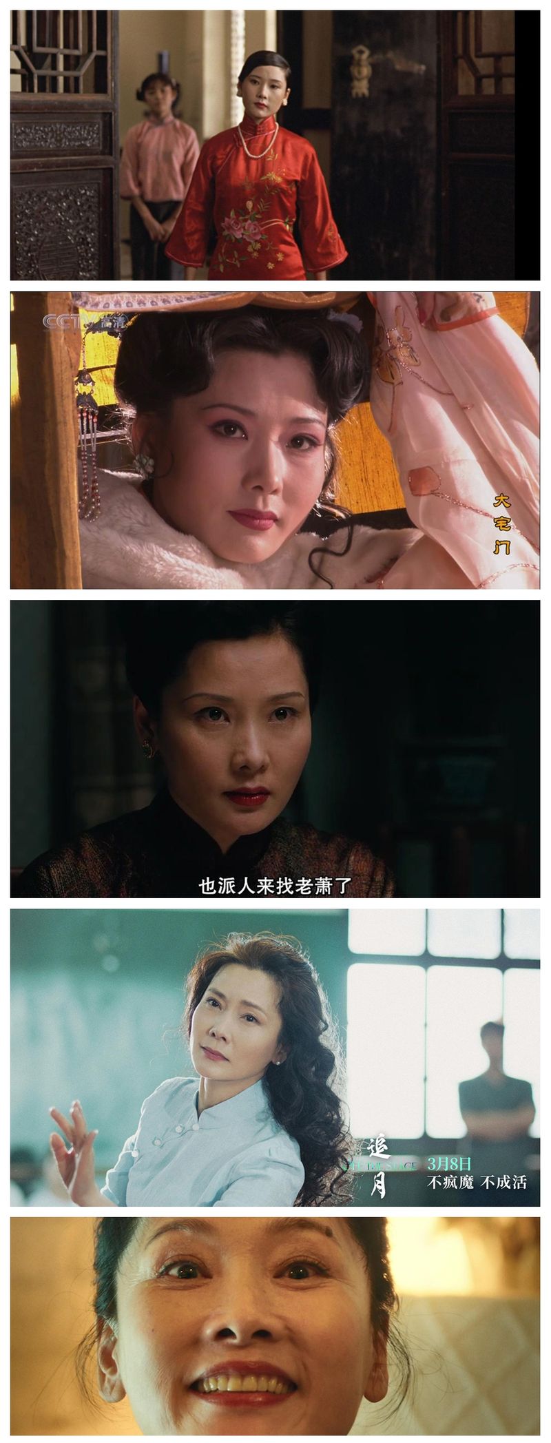 從上至下分別為何賽飛出演《大紅燈籠高高掛》《大宅門》《色,戒》《追月》《你行!你上!》劇照。